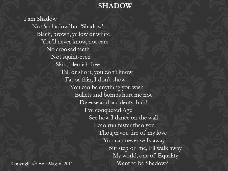 5. Love this! Not only the concept but the images that you’ve conjured with not only the words but how you designed the image with the poem on it. I want to be Shadow too. =)